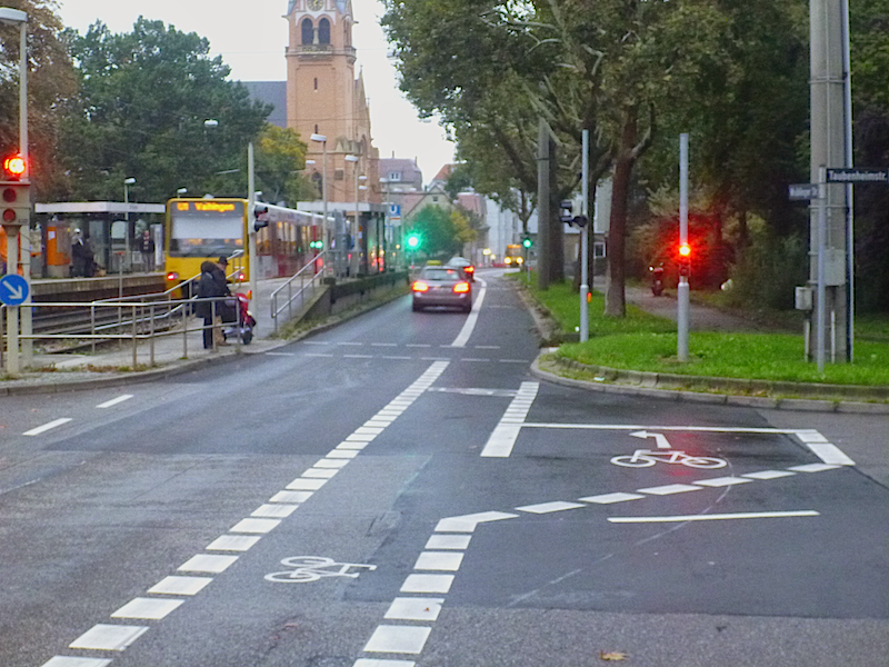 AntwortenLöschenBerichtigung: Der Normalfall in der StVO ist, dass Radfahrer auf demselben Fahrstreifen fahren wie die Kraftfahrzeuge, die in derselben Richtung abbiegen. Gibt es mehr als einen passenden Fahrstreifen, fahren Radfahrer auf dem am weitesten rechts. Nicht Normalfall ist es, dass geradeausfahrende Radfahrer auf dem Kraftfahrzeugrechtsabbiegefahrstreifen fahren. Dass Radfahrer eben dieses müssten, spukt in schon zu vielen Hirnen herum, und dass sie nichts Anderes könnten, auch in zumindest einem bei der Straßenverkehrsbehörde.
