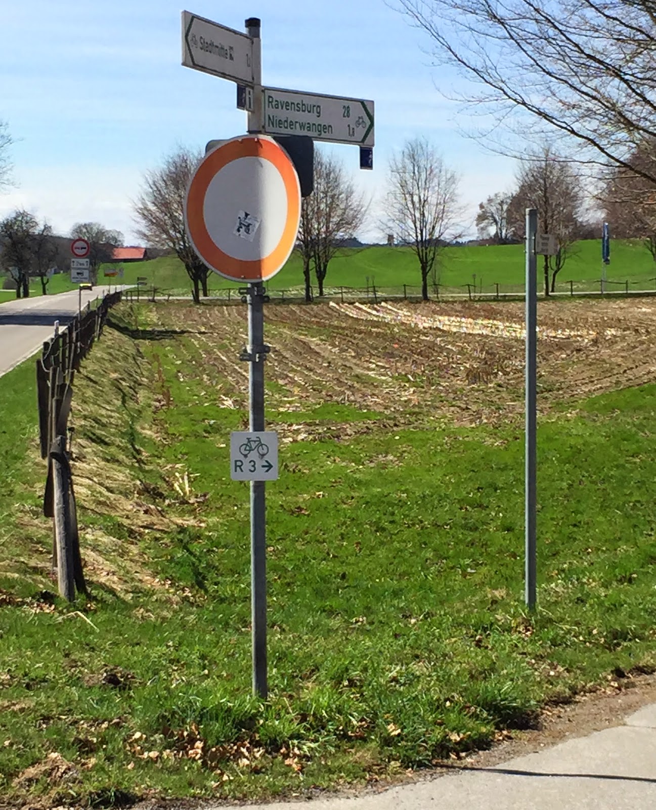 Sonntag gehts mit dem Rad raus aufs Land. Wir folgen einer Radroute. Und stoßen auf diesen Schildermasten. Er sagt: Hier ist deine Radroute. Aber du darfst hier nicht mit dem Rad fahren.